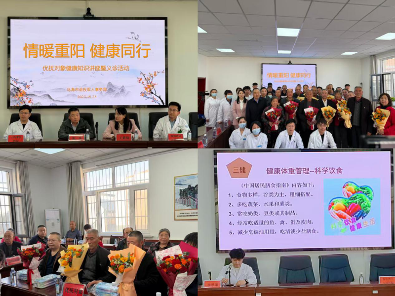 往日的艱苦奮戰和辛勤付出,在各位退役老兵、優撫對象身上刻下了榮光的印記,也留下了歲月的風霜。基于對他們身體健康的牽掛,市退役軍人事務局特別聯合中醫蒙醫醫院、海勃灣區人民醫院、第一口腔醫院、旭升眼科醫院開展“情暖重陽 健康同行”優撫對象健康知識講座暨義診活動,為健康保駕護航,將尊崇與關愛真正落到實處活動現場,第一口腔醫院為優撫對象送上口腔護理套盒,市退役軍人事務局工作人員向優撫對象獻花。隨后,海勃灣區人民醫院李思陽醫生帶來健康知識講座,中醫蒙醫醫院、海勃灣區人民醫院、第一口腔醫院、旭升眼科醫院醫護人員們為優撫對象一對一測量血壓、問診、理療,為大家的健康問題答疑解惑。此次活動不僅為優撫對象送上了節日溫暖與健康守護,更是一次貼近需求、傾聽心聲的務實之舉。
