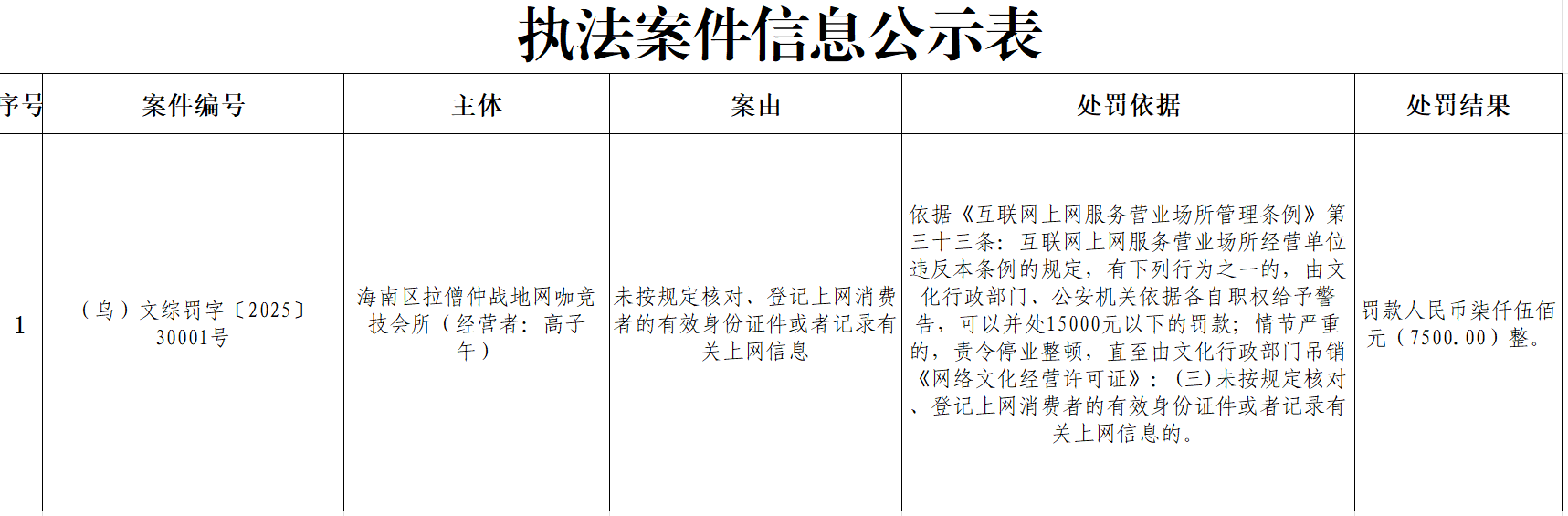 | 索??引??號 | 11150300011556741W/2025-03720 | 發(fā)文字號 | (烏)文綜罰字〔2025〕30001號 | ||||||