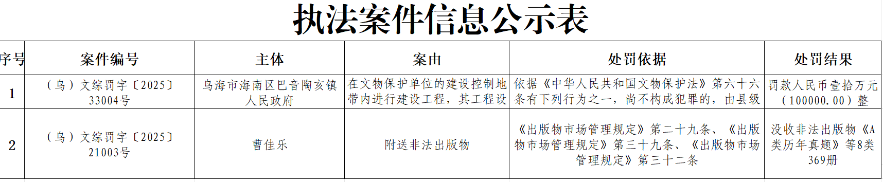 | 索??引??號 | 11150300011556741W/2025-05993 | 發(fā)文字號 | (烏)文綜罰字〔2025〕33004號 | ||||||